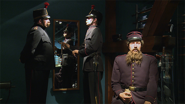 Schmitt´s template for „Xterminating Badges“ was Luis Buñuel‘s cinematic and surreal masterpiece „The Exterminating Angel“ from 1962. A group of rich and influential friends meet for an extravagant dinner party one evening and wake up the next morning in the same room, inexplicably incapable of leaving the villa. The macabre metaphor from  Franco-era Spain is not lost in present-day Zurich, where the police museum, bristling with confiscated weapons, is the claustrophobic setting for the drama. In recreating that Surrealist film, Schmitt made one change that, above all others, led to a remarkable result: all characters are played by police officers from the canton of Zurich. Schmitt’s interest in the police has to do with the delicate balance between freedom and security––when and why people give up one to gain the other.The police officers who took part in Schmitt’s method acting workshops can beseen, however, to enjoy the comic release from their professional personae. Schmitt, himself, also performs two characters: One is the Butler, who is serving the police officers and leading them to their subconcious paradise. The other character is the butler´s wealthy boss, who is the cops host. Master and servant in one person. Though law enforcement is perhaps the last thing some people would associate with absurdity, the scene where the characters mold clay into shapes combining their favorite tool or weapon with their favorite animal reveals just how symbolic the rules and iconography of law and order truly are––and how ripe they are for investigation.